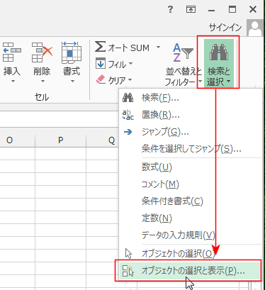 - [ホーム]タブの[検索と選択]→[オブジェクトの選択と表示]を選択します。