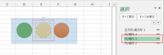 - 下図のような重なった図形で、背面に描画された図形はマウスのクリックでは選択することができません。