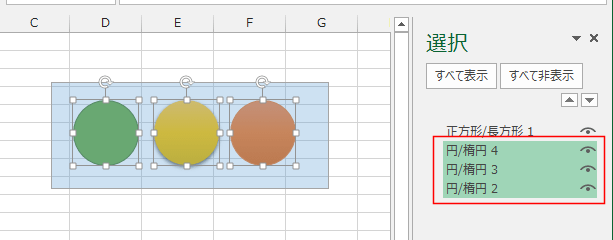 - 複数の図形を選択したいときは、選択ウィンドウで[Ctrl]キーを押した状態でオブジェクト名をクリックして選択します。