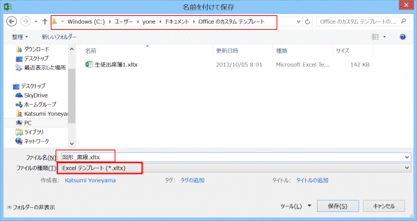 ファイル名を入力します。ここでは「図形_黒線.xltx」としました。