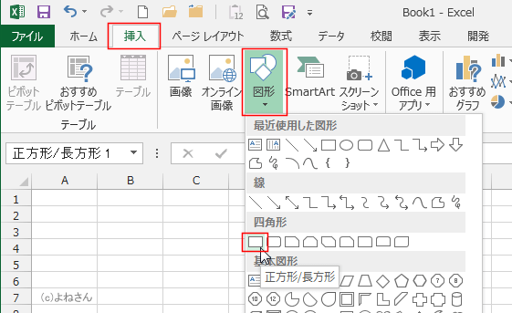 - [挿入]タブの[図形]→[正方形/長方形]を選択します。