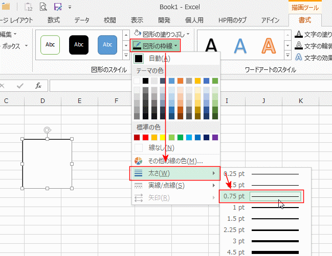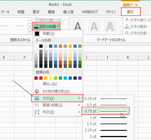 - 描画ツールの書式タブで[図形の枠線]→[太さ]→[0.75pt]を選択します。