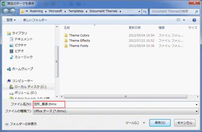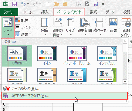 - [ページレイアウト]タブの[テーマ]→[現在のテーマを保存]を実行します。