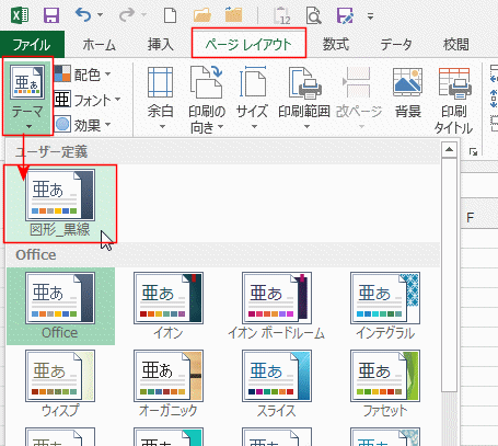- [ページレイアウト]タブの[テーマ]をクリックして、ユーザー定義にある登録したテーマを選択します。