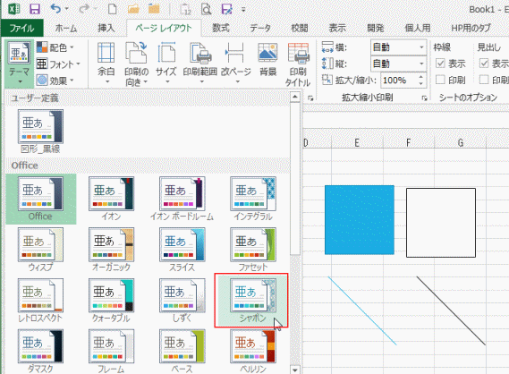 - Excel2013を起動したときは、[Office ]が適用されていますので、青色に塗りつぶされた図形が描画されます。