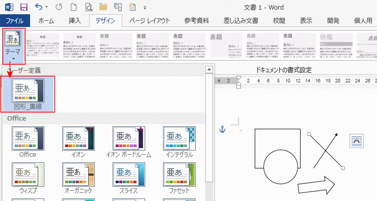 下図はテーマ「ジャポン」をポイントしたところです、テーマ「Office」で描画した図形のみが変更される様子が分かります。