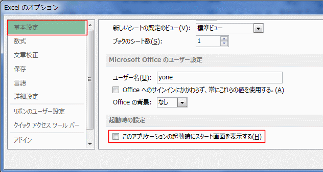- [基本設定]を選択し、「起動時の設定」で「このアプリケーションを起動時にスタート画面を表示する」のチェックを外します。