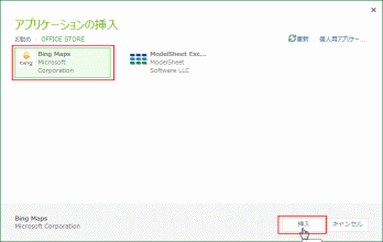 [Office Store]をクリックし、[BingMaps]を選択して[挿入]ボタンをクリックしました。