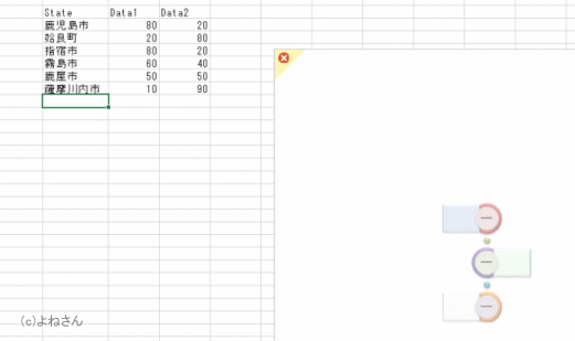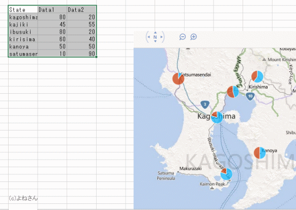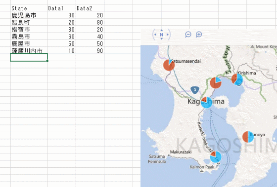 - シートにデータが入力され、地図に円グラフが表示されました。