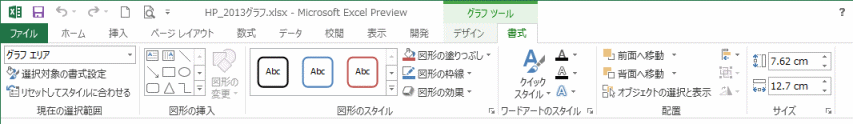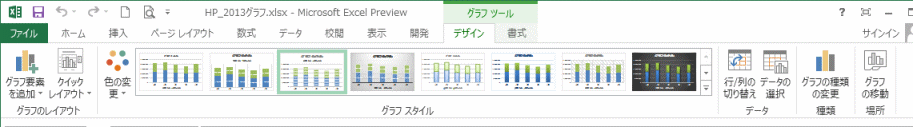- Excel2013のグラフ ツール リボンはExcel2010と比べて、タブが2個になり、コマンドが整理されているようです。