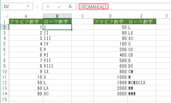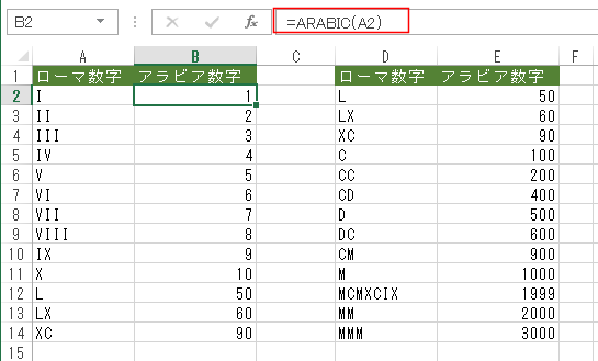 | 3 | ARABIC | ローマ数字をアラビア数字に変換します。 アラビア数字を、ローマ数字を表す文字列に変換するときはROMAN関数を使います。 |