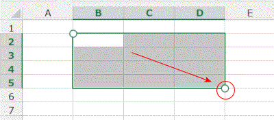 選択範囲をB2セルからB2:D5へ広げる・・・といった感じの操作になります。