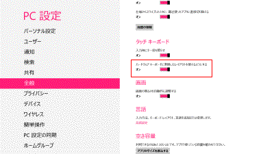 - [全般]をタップし、「ハードウェアキーボードに準拠したレイアウトを使えるようにする」のスイッチをタップして「オン」にします。
