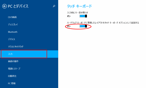 - 「入力」を選択して、「ハードウェアキーボードに準拠したレイアウトをタッチキーボード オプションとして追加する」を「オン」にします。
