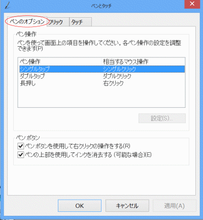 - 下図は[ペンのオプション]タブを表示しています。