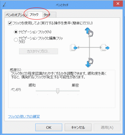 - 下図は[フリック]タブを表示しています。