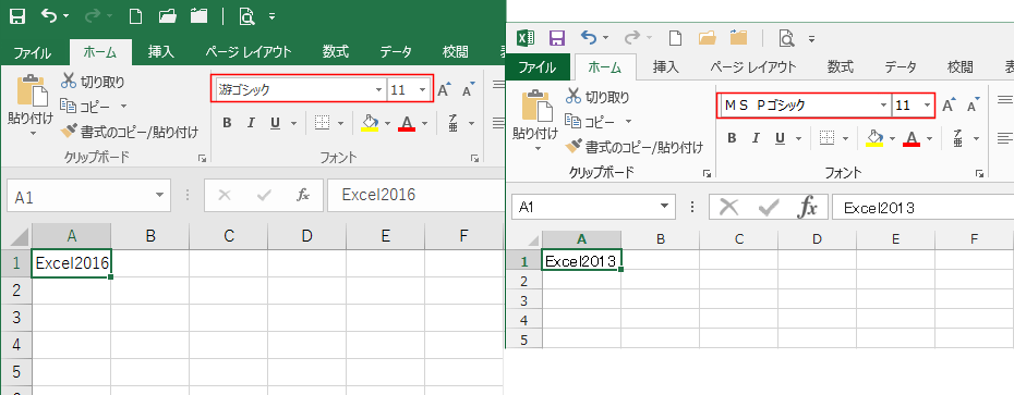 異なるのはフォントがExcel2016では「游ゴシック」と変わっていることです。Excel2013では「MS Pゴシック」でした。
