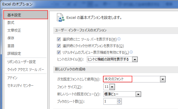 - [基本設定]を選択すると、「次を既定フォントとして使用」が「本文のフォント」となっています。