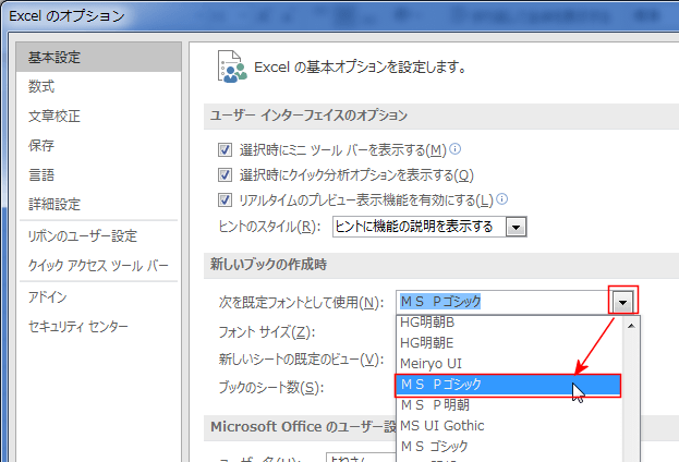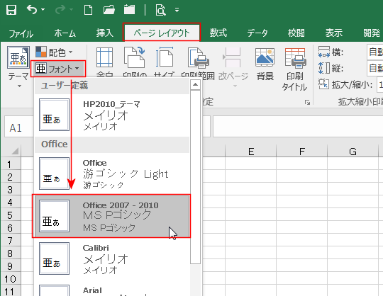 [ページレイアウト]タブの[フォント]→「Office2007 - 2010 MS Pゴシック」を選択します。