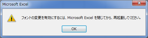 - 「フォントの変更を有効にするには、Microsoft Excelを閉じてから、再起動してください」と表示されます。