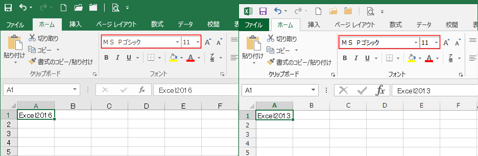 下図は左がExcel2016、右がExcel2013の画面です。A1セルの位置を合わせて表示していますので、セルの高さ(行の高さ)が異なっているのが分かると思います。