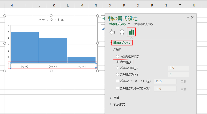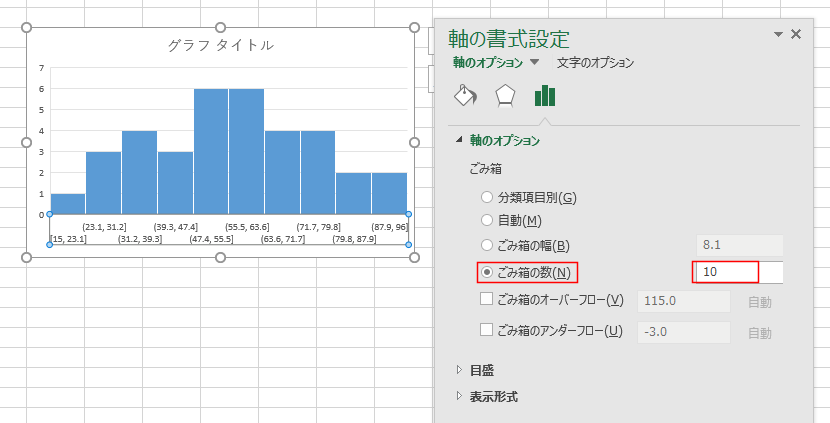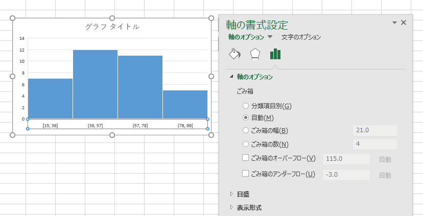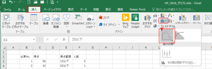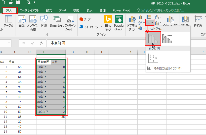 - Excel2016では統計グラフの挿入からヒストグラムを作成することができるようになっています。