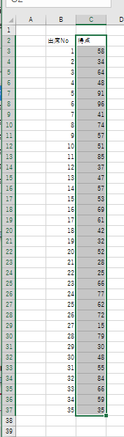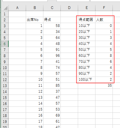 - 下図のような得点分布のデータを使ってヒストグラムを作成します。
