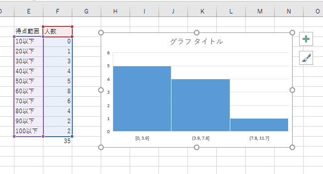 (この作成されたグラフは人数が0〜3.9が5個、3.9〜7.8が4個、7.8〜11.7が1個といったグラフのようです。)