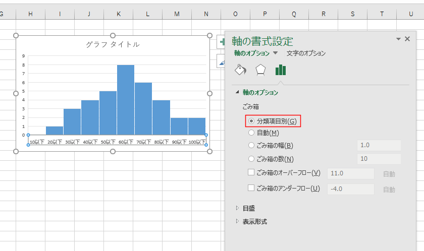 - 「分類項目別」を選択すると、期待したヒストグラムになりました。