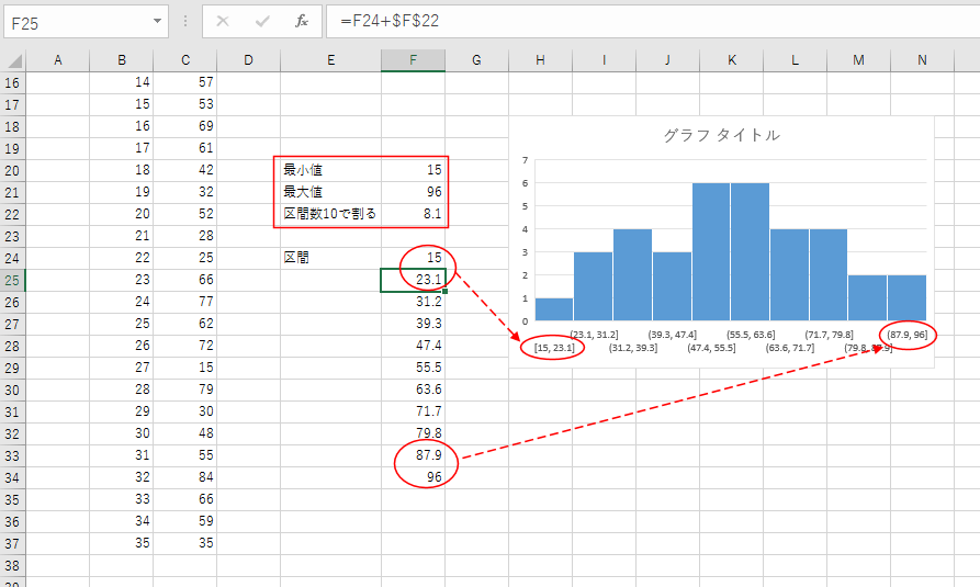 - ここではデータの最小値と最大値を10等分して、各区間のデータ数を求めてヒストグラムが作成されていることが分かります。
