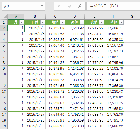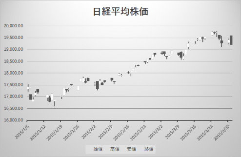 データは下図のように月、日付、始り値、高値、安値、終値の順番に配置しています。