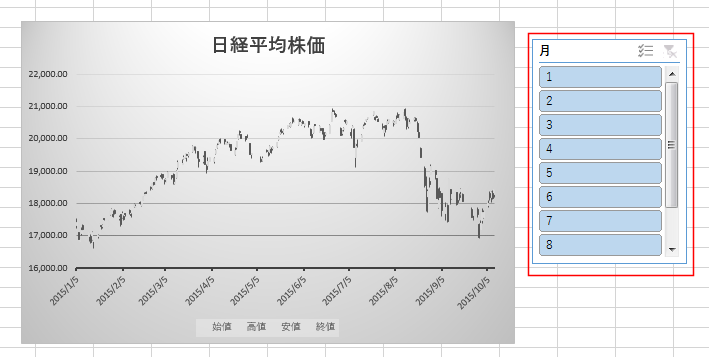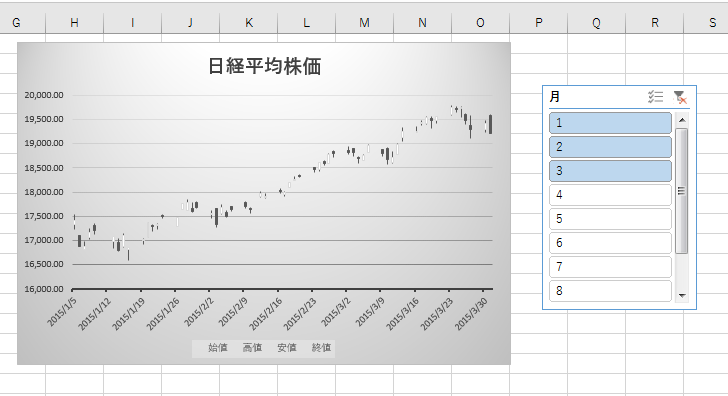 ここの例ではフィールド「月」が邪魔になります(余計なものになります)ので、日付〜終値のデータを選択して、「始値-高値-安値-終値」を選択します。