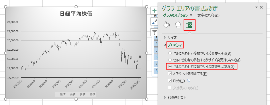 プロパティで「セルに合わせて移動やサイズ変更をしない」にチェックを入れます。