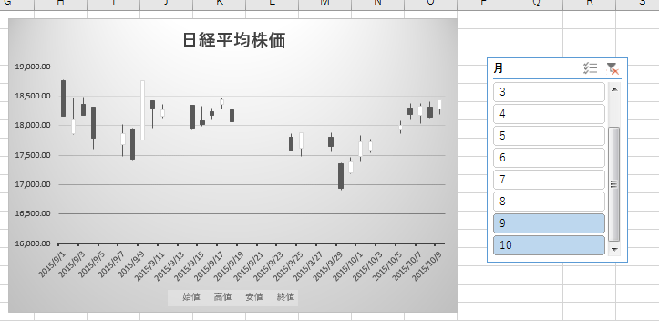 - スライサーで9月〜10月のデータに絞り込み、グラフに表示した例です。