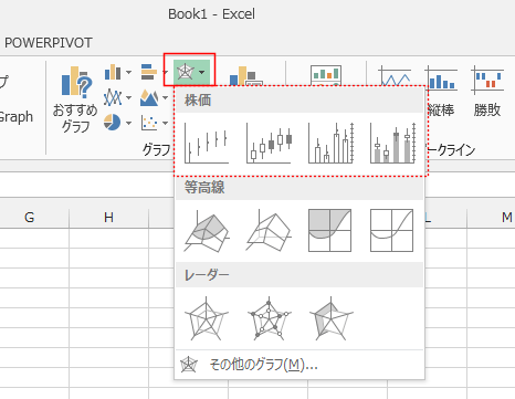 - 以前のExcel2013では「株価チャート、等高線グラフ、またはレーダーチャートの挿入」というコマンドから選択するようになっていました。
