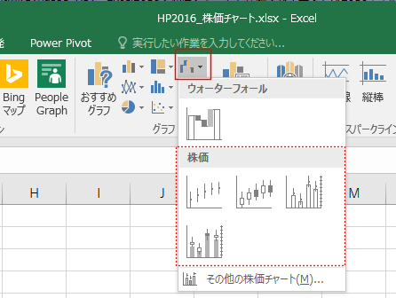 Excel2016では「ウォーターフォール図または株価チャートの挿入」というコマンドから選択することができます。