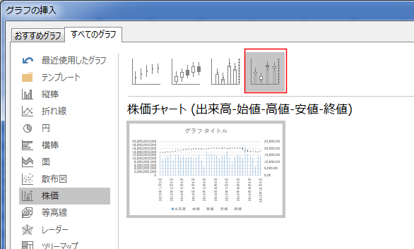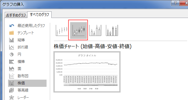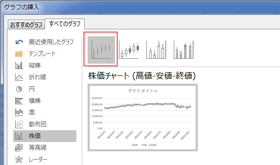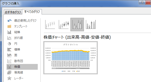 - Excel2016の株価チャートの種類はExcel2013と同様で4種類です。
