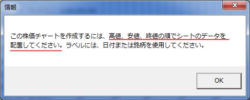 下図は「高値-安値-終値」を選択した時、データの配置が指定と異なっているとの情報が表示された時のものです。