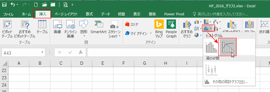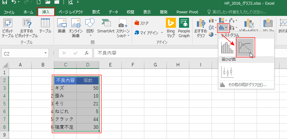 [挿入]タブの[統計グラフの挿入]→[パレート図]を実行します。