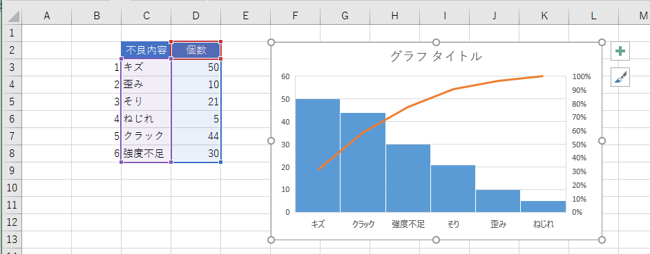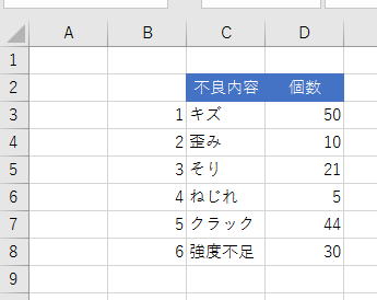 - 下図のような不良内容と個数のデータを使ってパレート図を作成します。