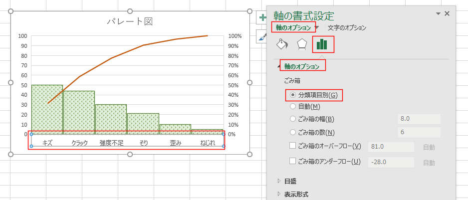 - パレート図が期待するものと異なる時は軸の書式を変更してみてください。