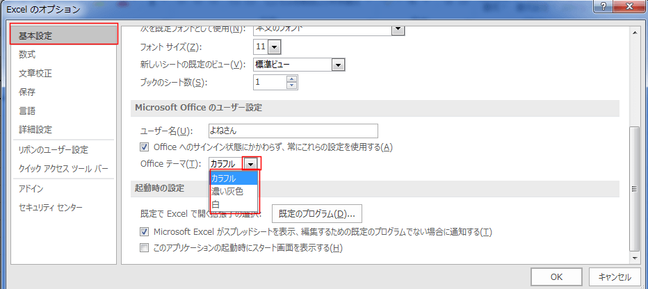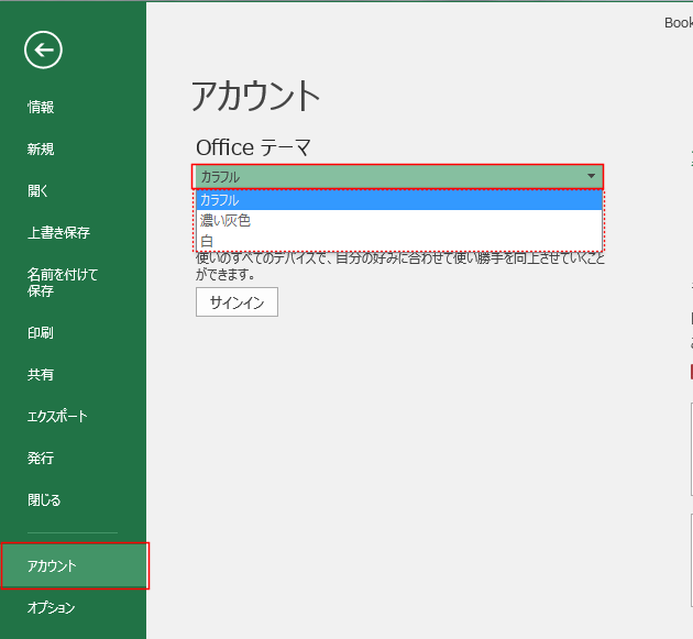 「Officeテーマ」で選択します。カラフル、濃い灰色、白の3種類から選択ができます。