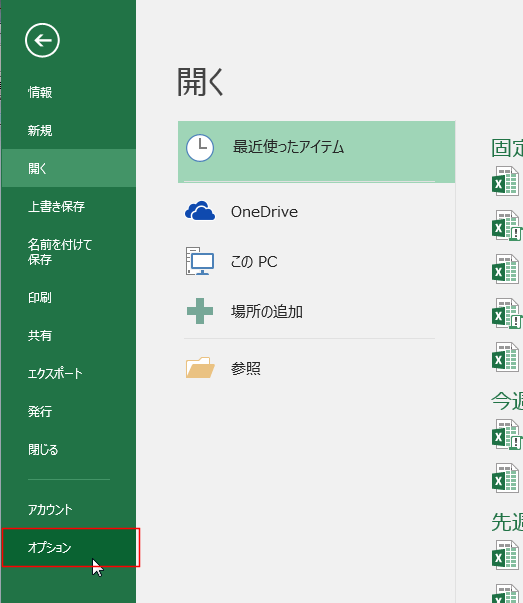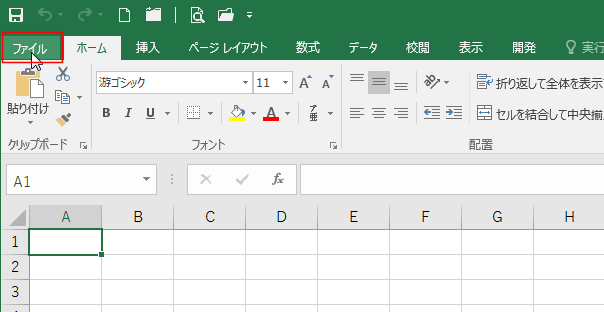 - Excel2016の[ファイル]タブをクリックして、バックステージを表示します。