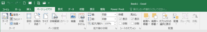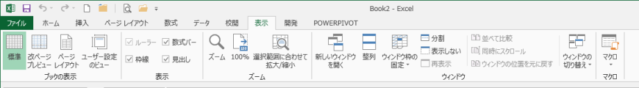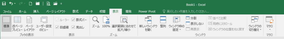 - 表示グループで、Excel2013の[枠線]がExcel2016では[目盛線]に変更されています。