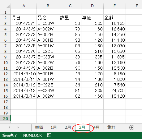 E3セルの数式は =SUMIF('3月'!$B$3:$B$17,集計!$B3,'3月'!$E$3:$E$17)