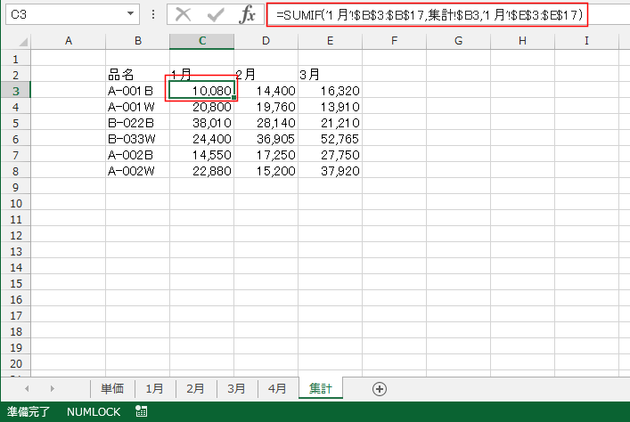 - C3セルの数式は =SUMIF('1月'!$B$3:$B$17,集計!$B3,'1月'!$E$3:$E$17) として、下方向へ数式をコピーします。