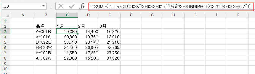 =SUMIF(INDIRECT(C$2&"!$B$3:$B$17"),集計!$B3,INDIRECT(C$2&"!$E$3:$E$17"))