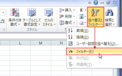 [ホーム]タブの[編集]グループにある[並べ替えとフィルター]→[フィルター]を実行します。