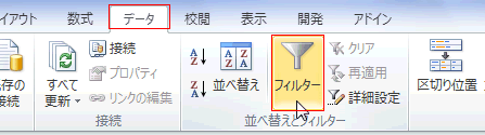- または、[データ]タブの[並べ替えとフィルター]グループにある[フィルター]を実行します。