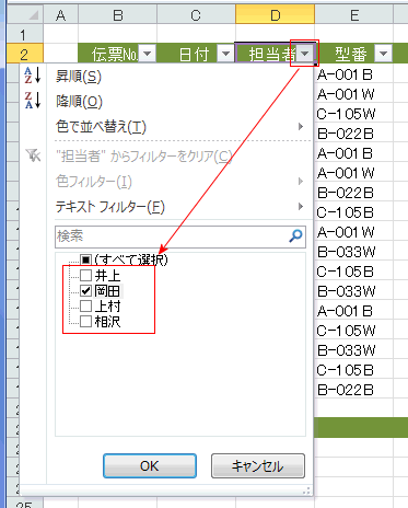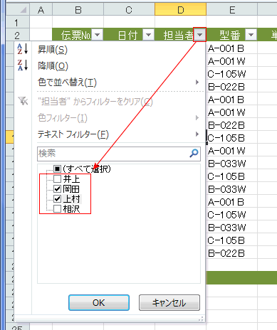 - D列の列見出し(フィールド名)「担当者」の右の[▼]ボタンをクリックします。